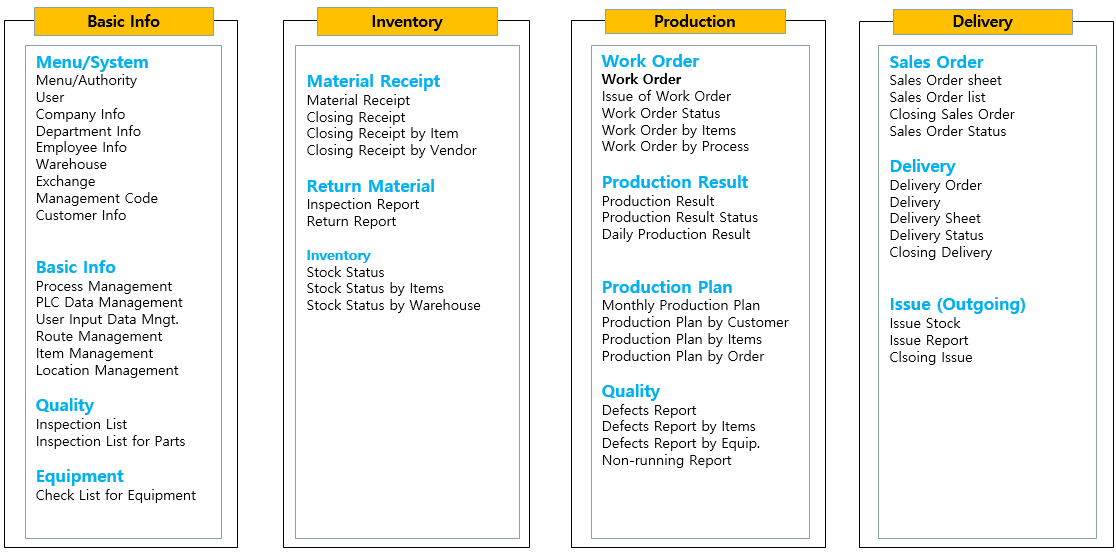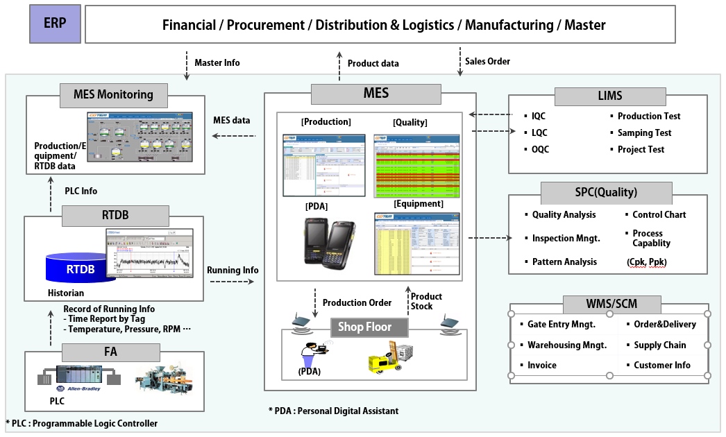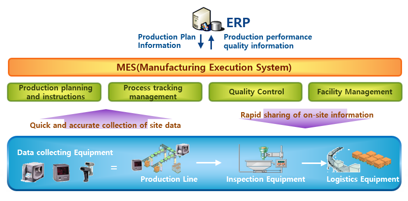 "MES" is an abbreviation of Manufacturing Execution System and it is a management system to support all kinds of activities (scheduling, work instructions, quality control, job performance aggregation and so on). This system is an integrated information system that provides more useful and systematic data that is generated in the production site.